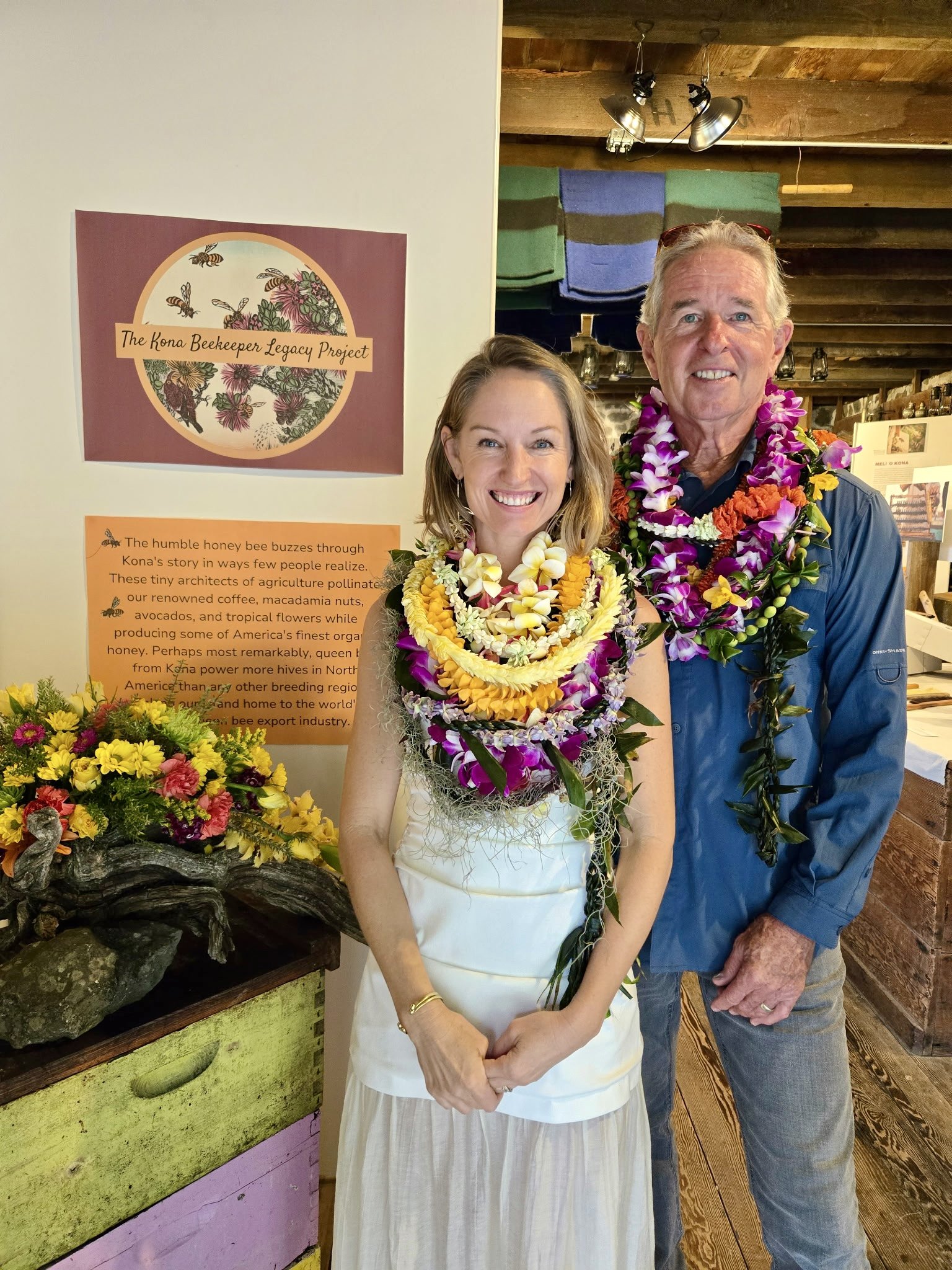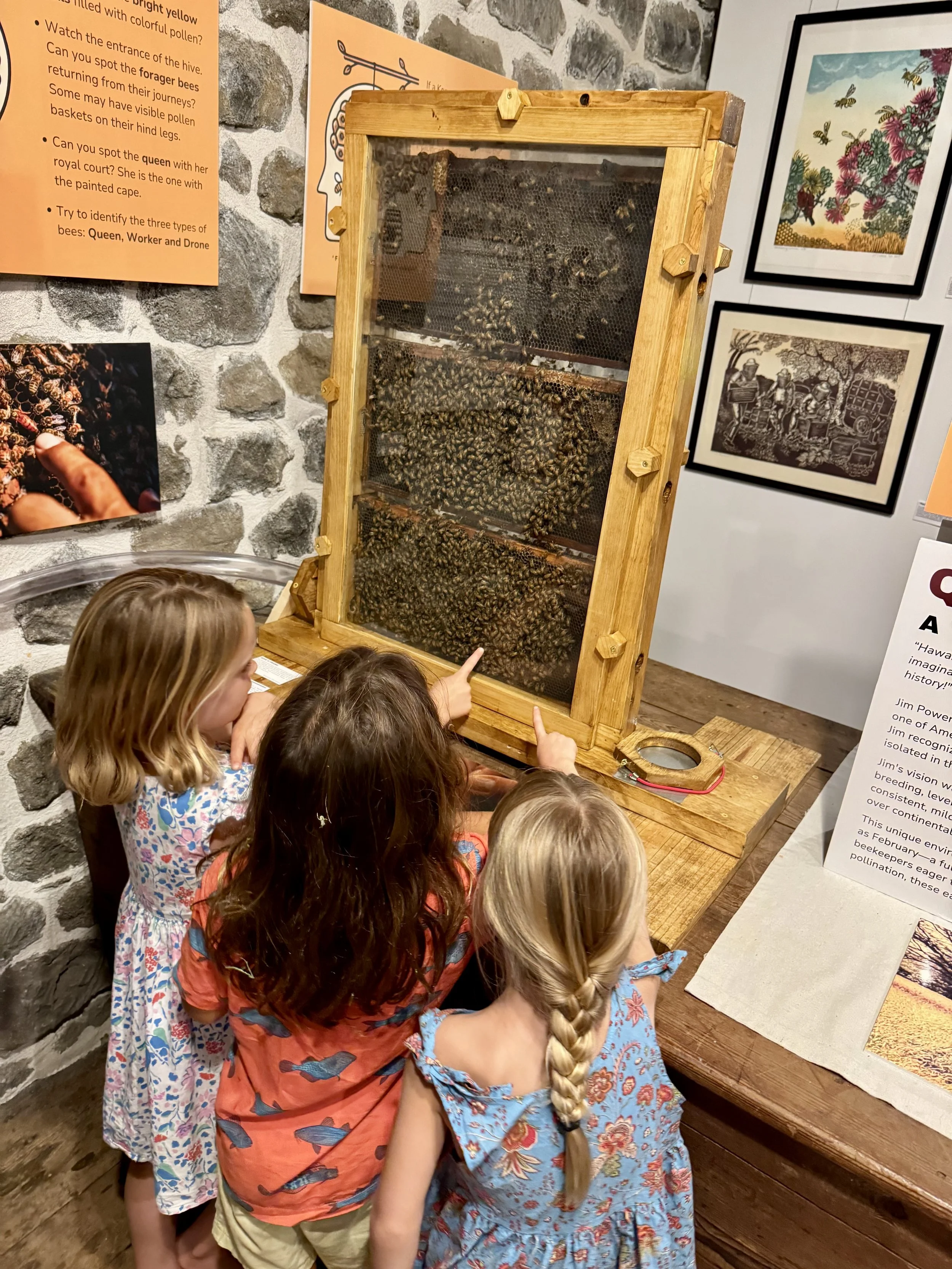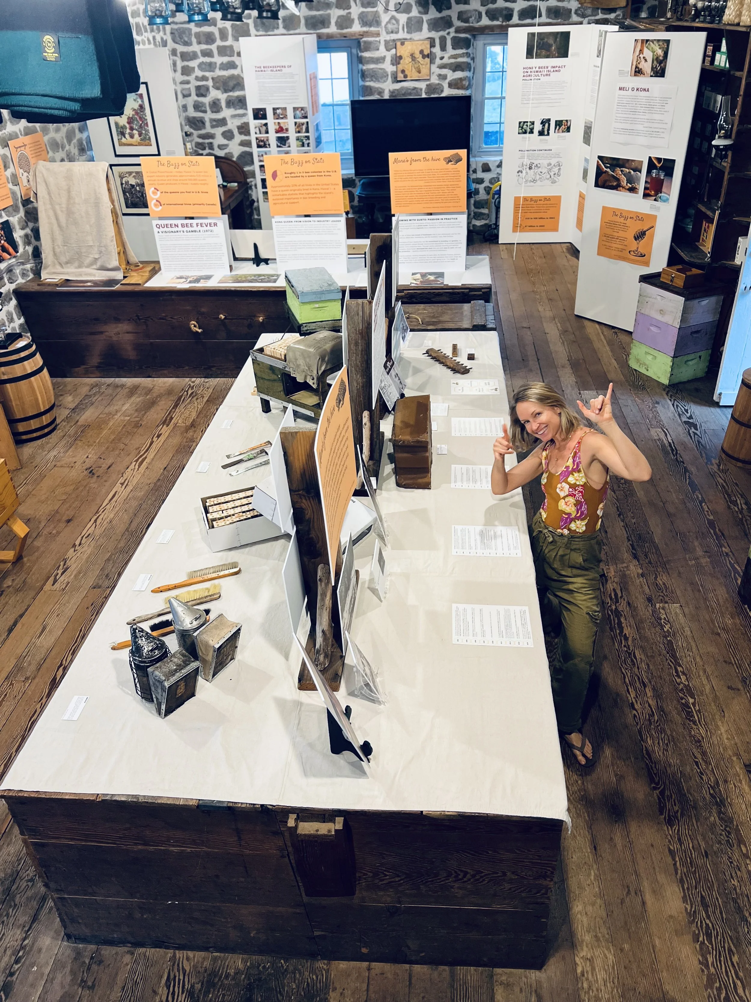 Testimonial from past docent: “I was naturally curious about the exhibit, but not expecting my literal AWE at the immense information provided, my sudden proactive interest in emailing a few old friends in California who keep bees but who haven’t heard from me in years, to watch Queen Bee YouTube videos, and to help people who enter the exhibit LOVE it! I don’t have to help them love it, though; each person finds their own way. For some, it is the live bees and finding the queen. For some it is the art. For some, it is the Talk Story. And for many, it is the documentary introducing the individual people and their dedication and love of beekeeping.” - Sally, Kona Historical Society Docent